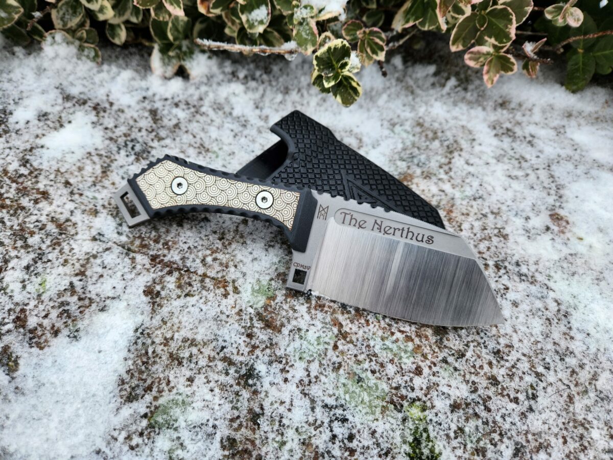 The Nerthus comes standard with a very nice TPU sheath and matte blade. If you would like other handle inlays, please leave us a short note in the comments during the ordering process. The Nerthus is an everyday knife that is also very suitable for cooking. The very high bevel and the cleaver shape make it ideal for kitchen and barbecue evenings. Of course, the knife is also very good for all other everyday tasks.